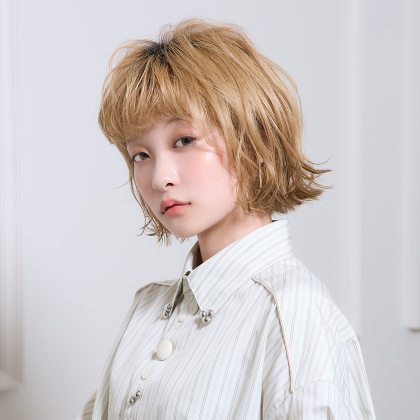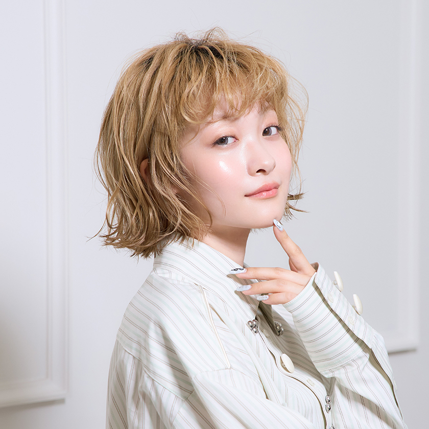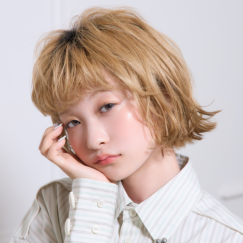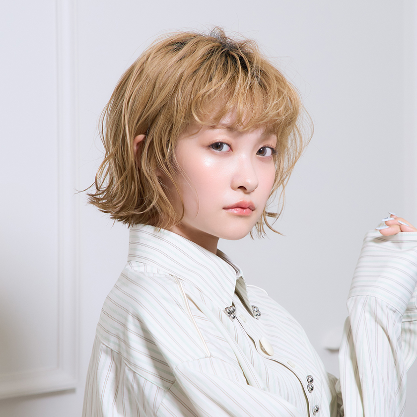 ふわふわのウェーブ感と透明感のあるハイトーン+毛先のローライトにカールをつけた大人可愛いミニボブスタイル。毛先は外はねで立体的に〇 メイクはクリアなコーラルカラーでヘルシーに♪ ヘア 川北 亮介(資生堂 サロン&スパ 大阪) メイク 鄧 秋蓉(シセイドウパサージュボーテ)