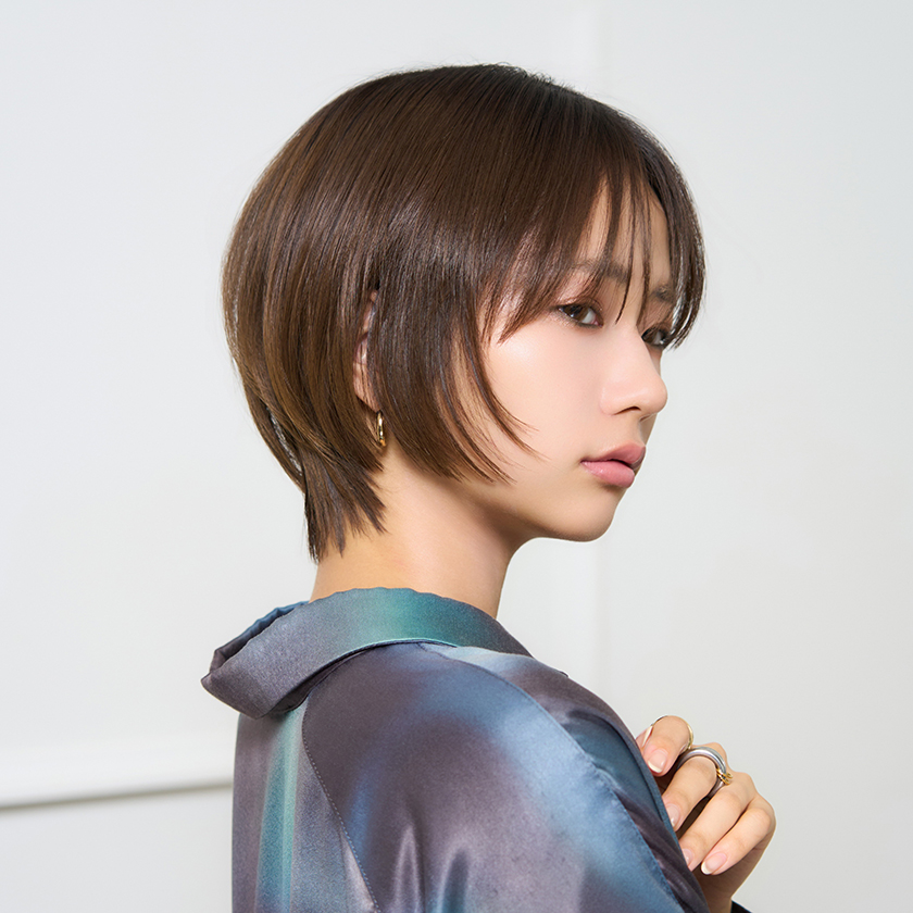 丸みのある毛先軽めの丸みショートスタイル。縦長のシルエットで大人な落ち着き感とモードな雰囲気を感じさせてくれるスタイルです◎ カーキのアイラインで目力アップ! ヘア 大久保洸哉(ビューティー チューン 資生堂 日本橋高島屋S.C.店) メイク 鄧 秋蓉(シセイドウパサージュボーテ)
