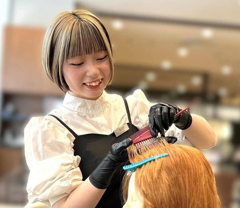 元々ヘアアレンジが好きで、カットやカラーだけでなくアレンジやメイク、そしていつかは着付もやりたいと思っていて…。資生堂美容室はそのすべてを叶えることができるサロンだったので【ここしかないな】と決めました。学生時代にいろいろなサロンにお客さんとして行き、接してくれたアシスタントの人にアドバイスをもらったりもしていました。毎日終電まで練習しているとかサロンの近くに引っ越したというかたもいて、そういう働き方は私には無理だなと思いました。長く働きたいと考えていたので体力的にも無理なく勤められる当社を選びました。